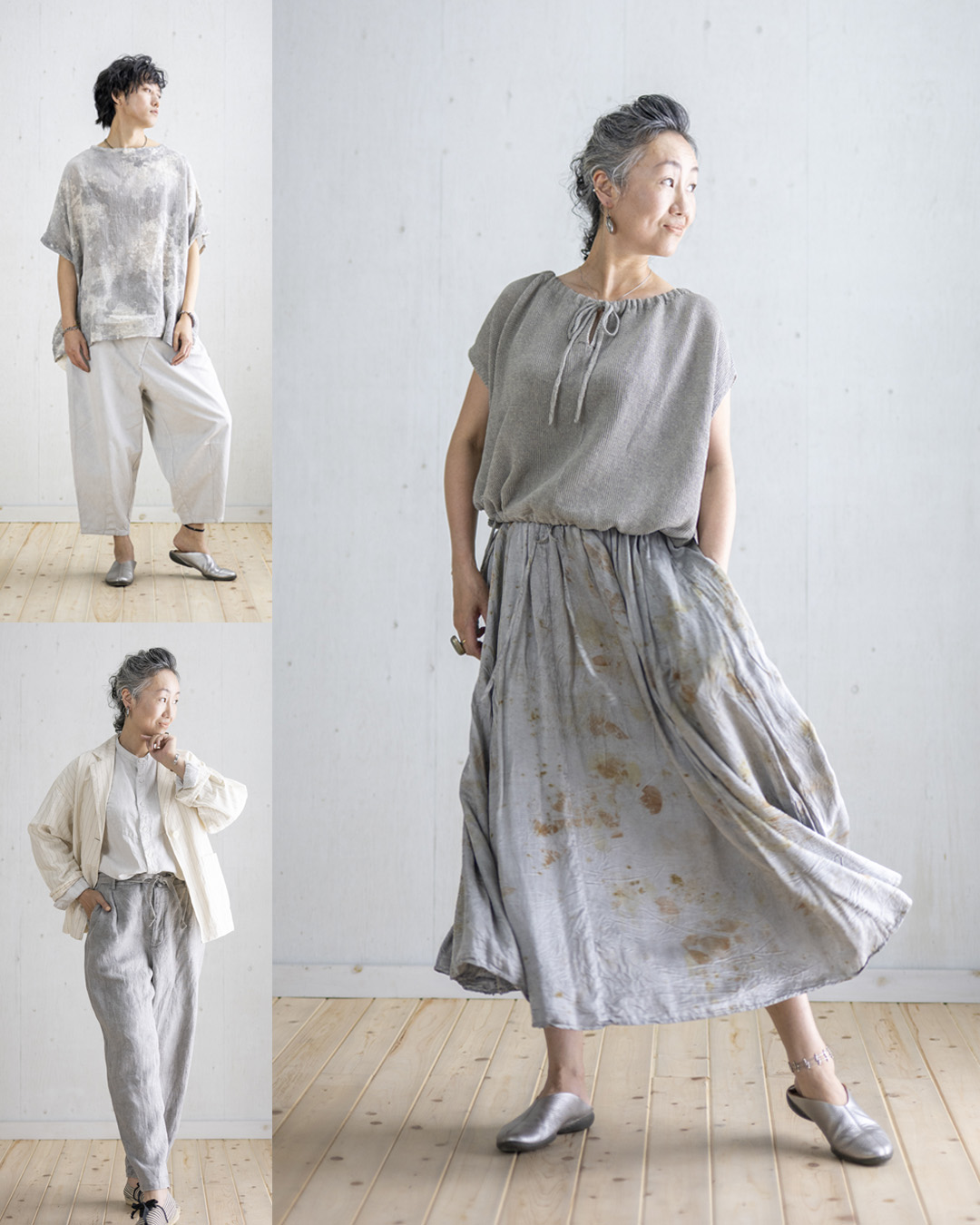 軽やかな墨染めや、今すぐ使える羽織りもの、宝島染工の定番の切替シャツなどを中心に、衣類やストールなどが並びます。