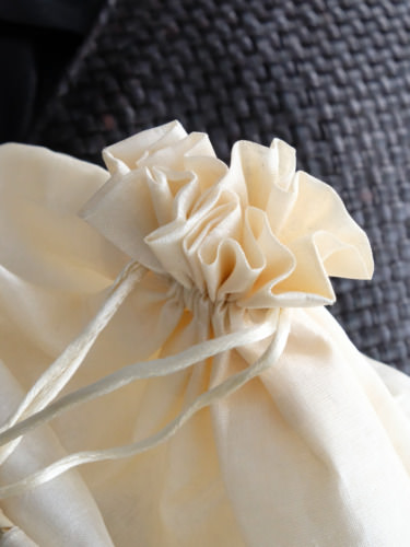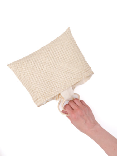 Lサイズは紐を持手にしたり、リングを持手にしたり、肩に掛けたり、さまざまな楽しみ方ができます。Sサイズは、リングが付いていないので、紐を持ち手に。