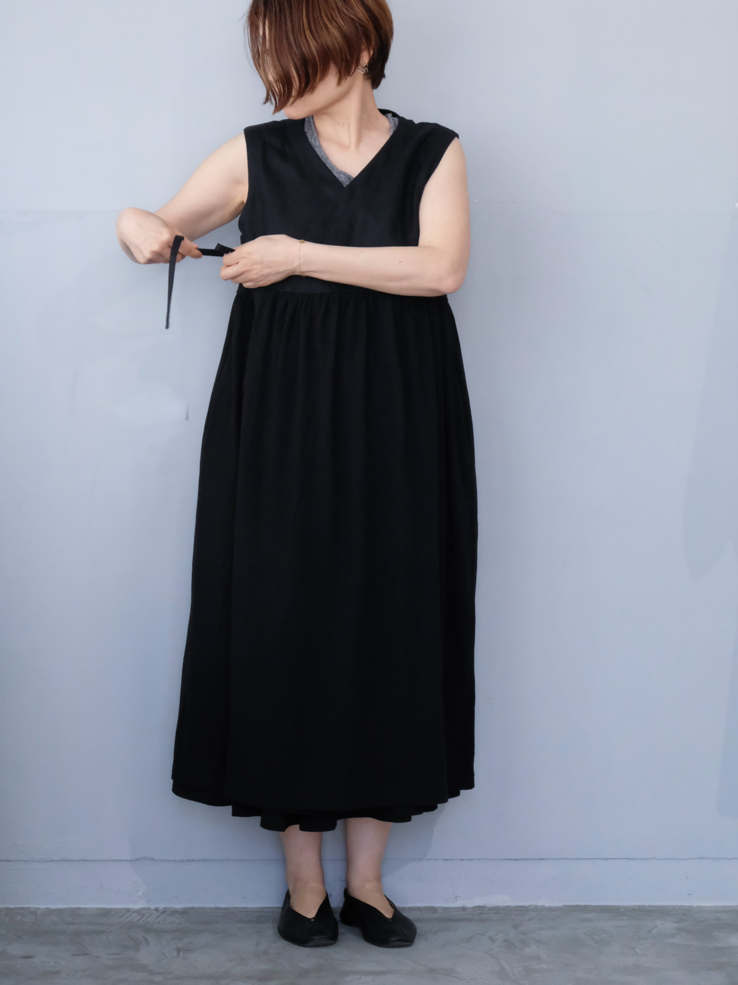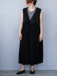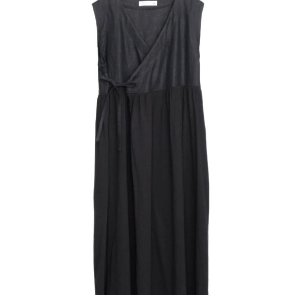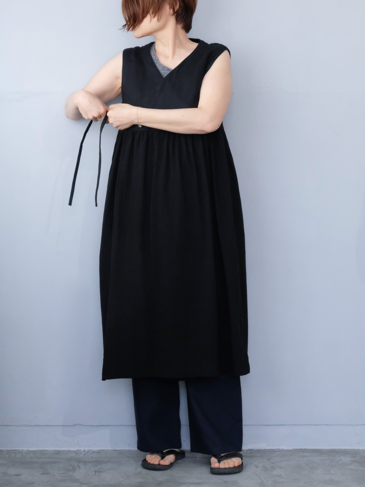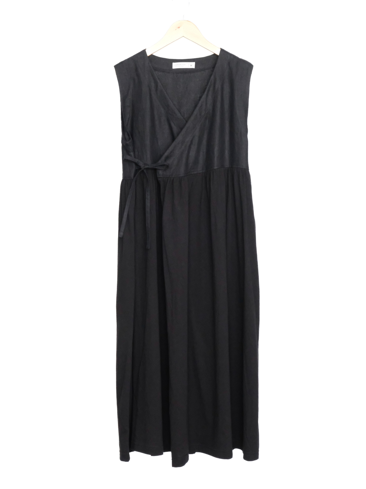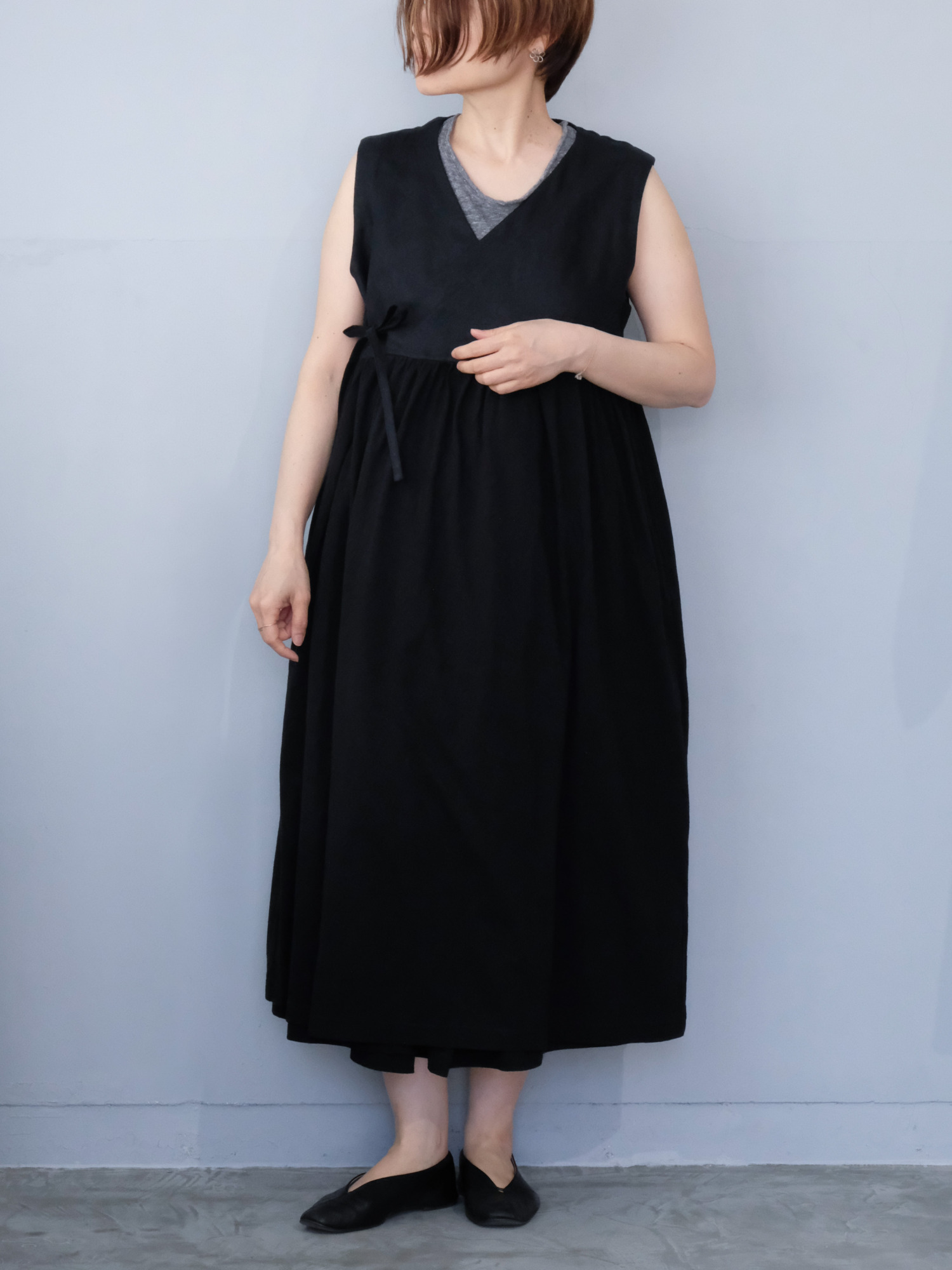 上は40リネンツイル、下は通常ゲージで編まれた30天竺を素材違いの組み合わせのノースリーブのカシュクールワンピース。