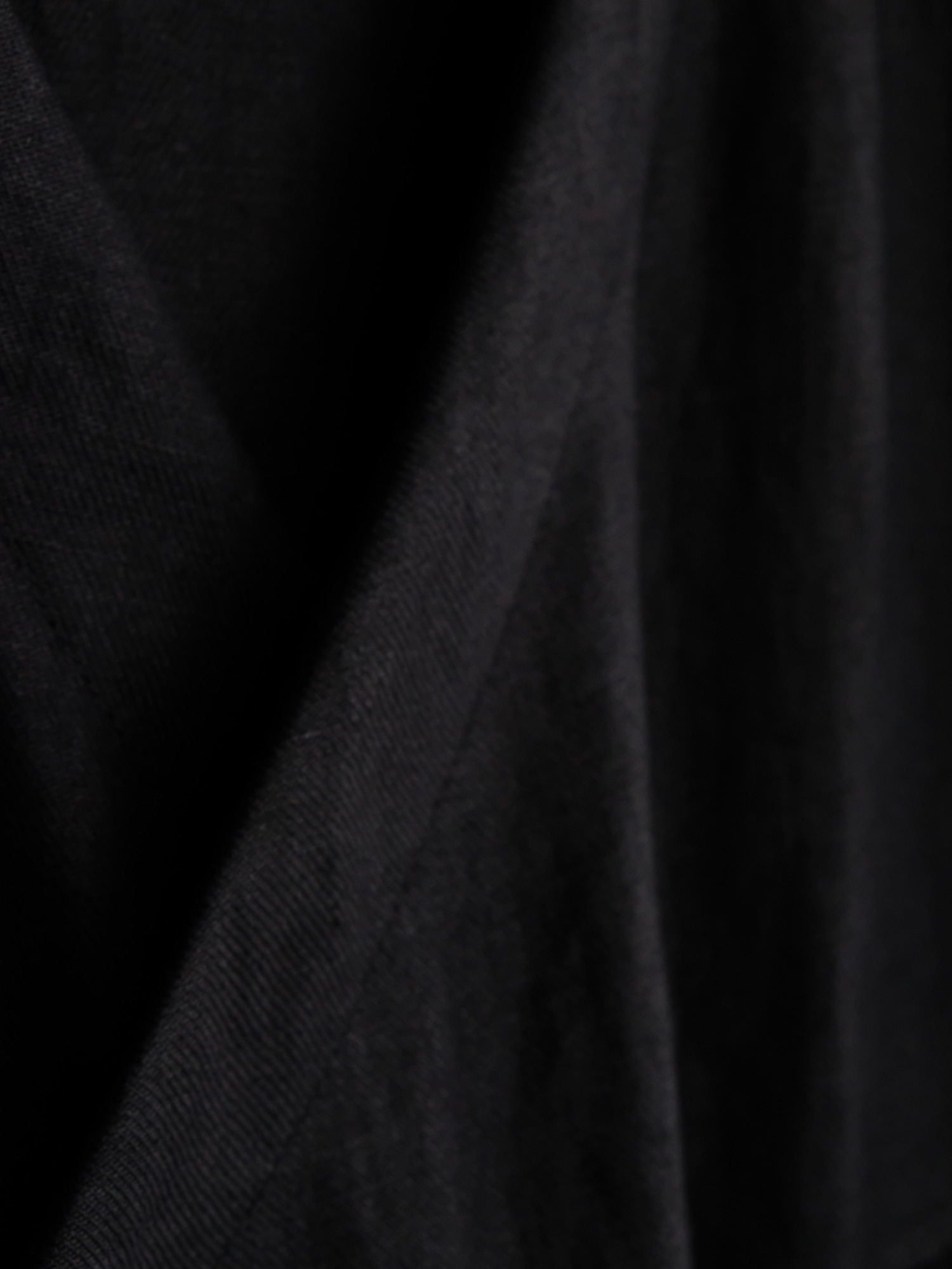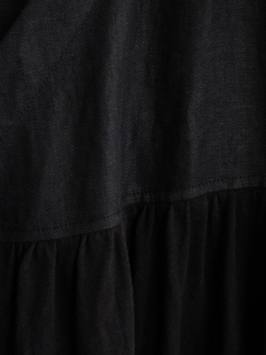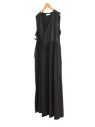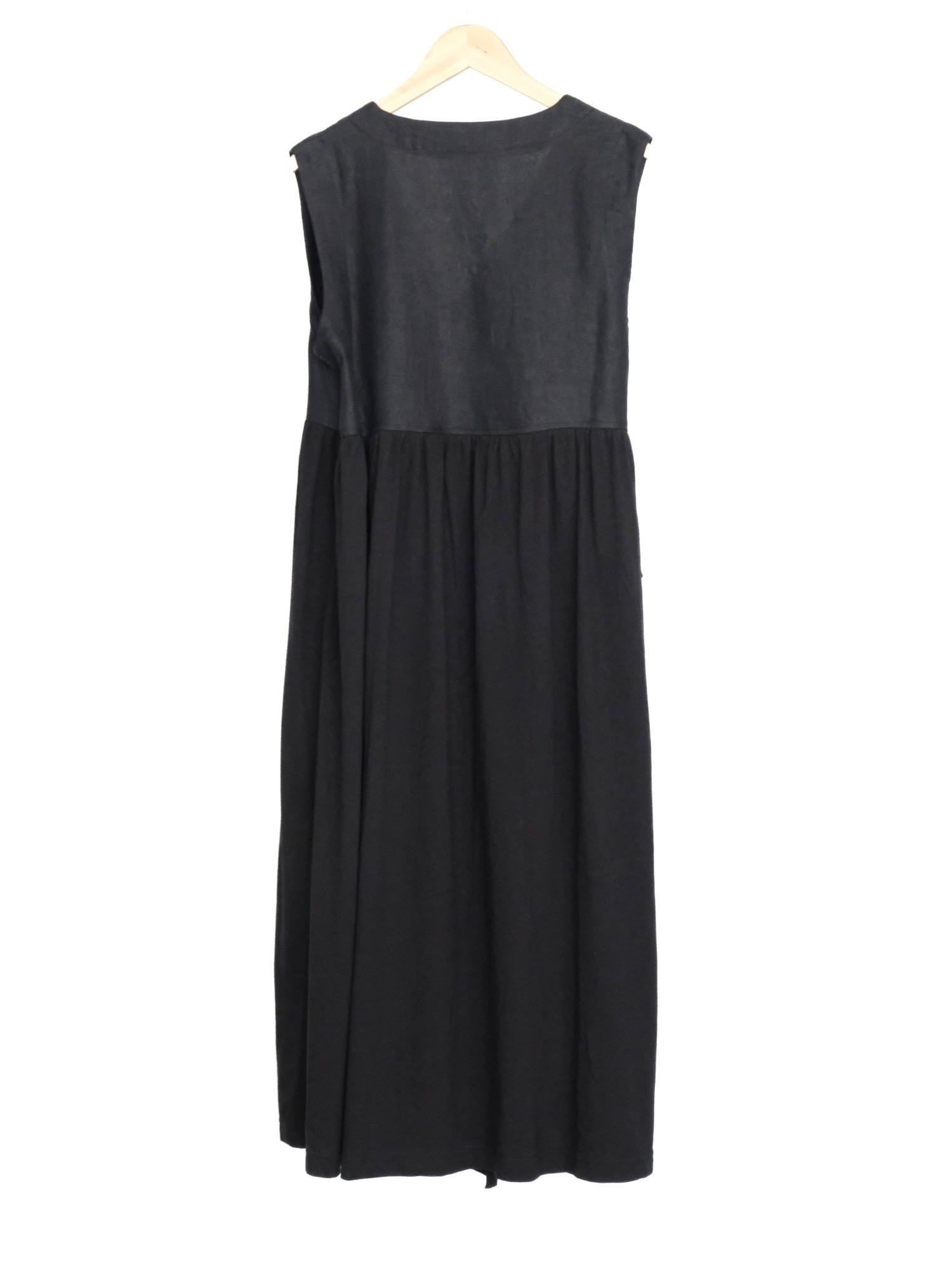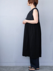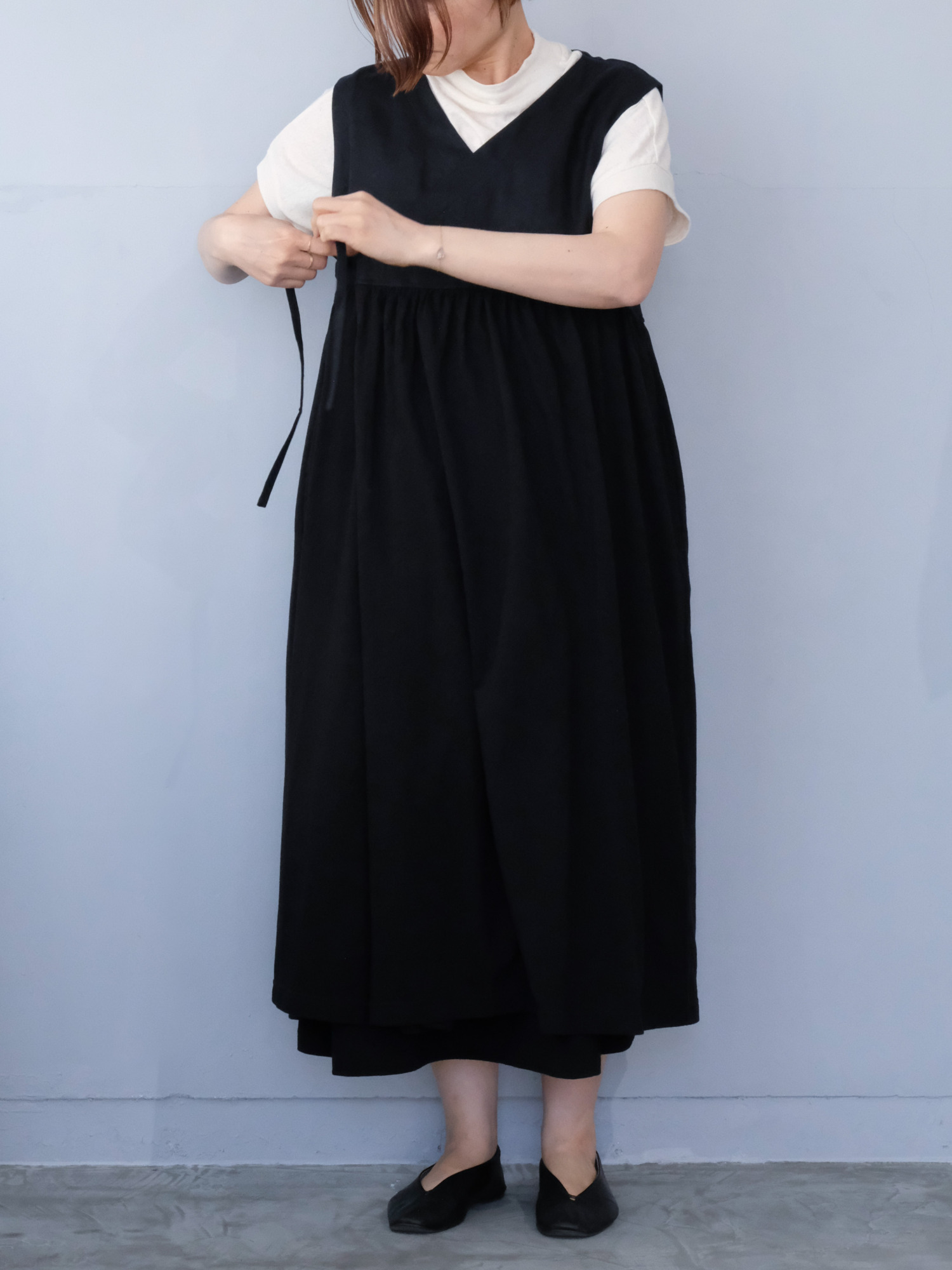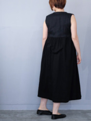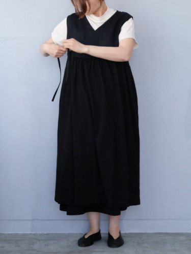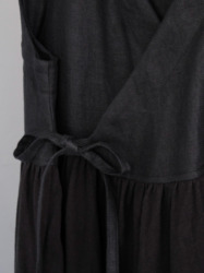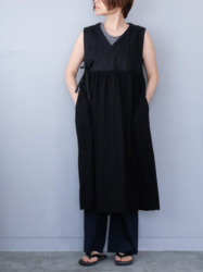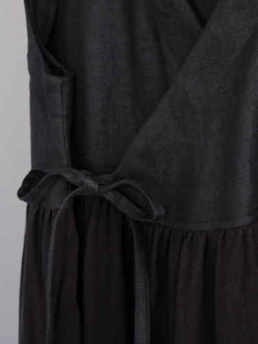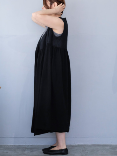 上は40リネンツイル、下は通常ゲージで編まれた30天竺を素材違いの組み合わせのノースリーブのカシュクールワンピース。