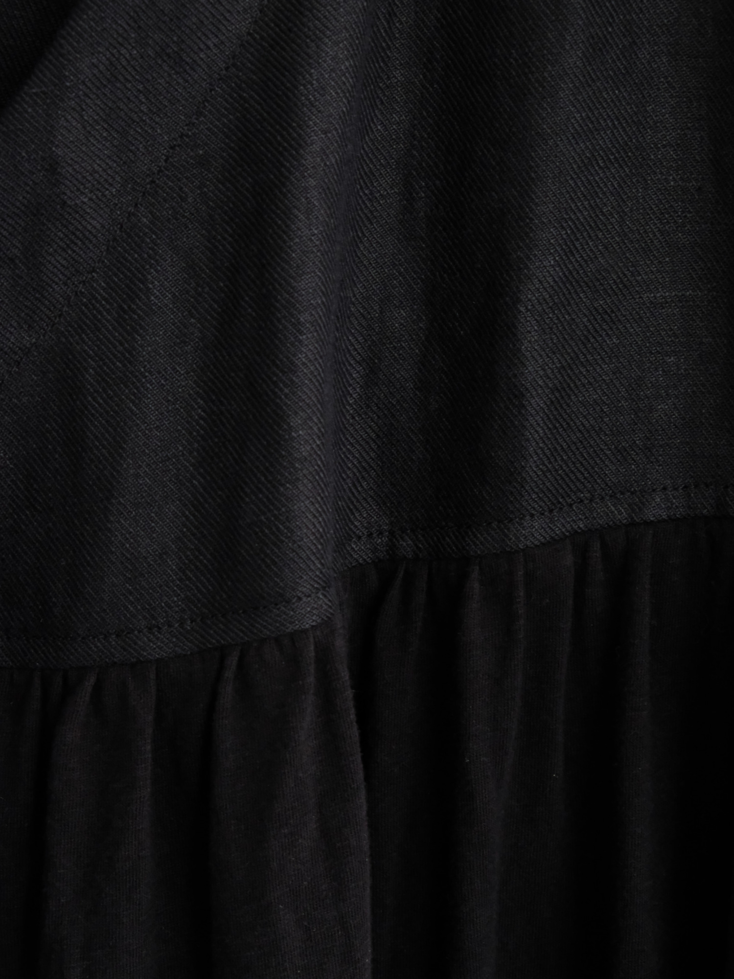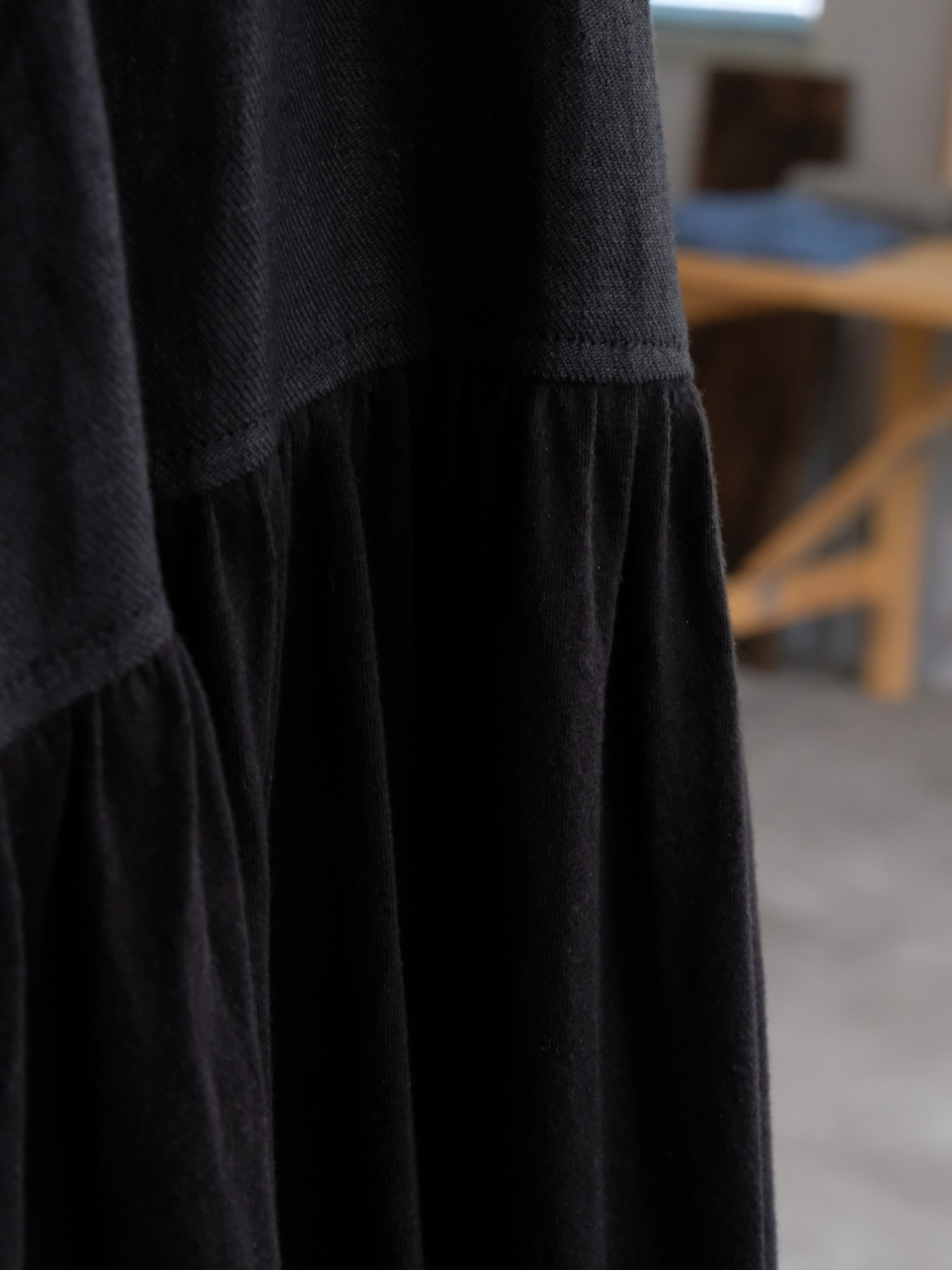 スカート部分はさらりとした天竺(コットン)なので、ドレープのあるシルエットが生まれ、よりフェミナンな印象になります。暑いときはタンクトップなどと合わせたり、秋冬はタートルニットやCネックのニットと合わせ着用してもおすすめです。