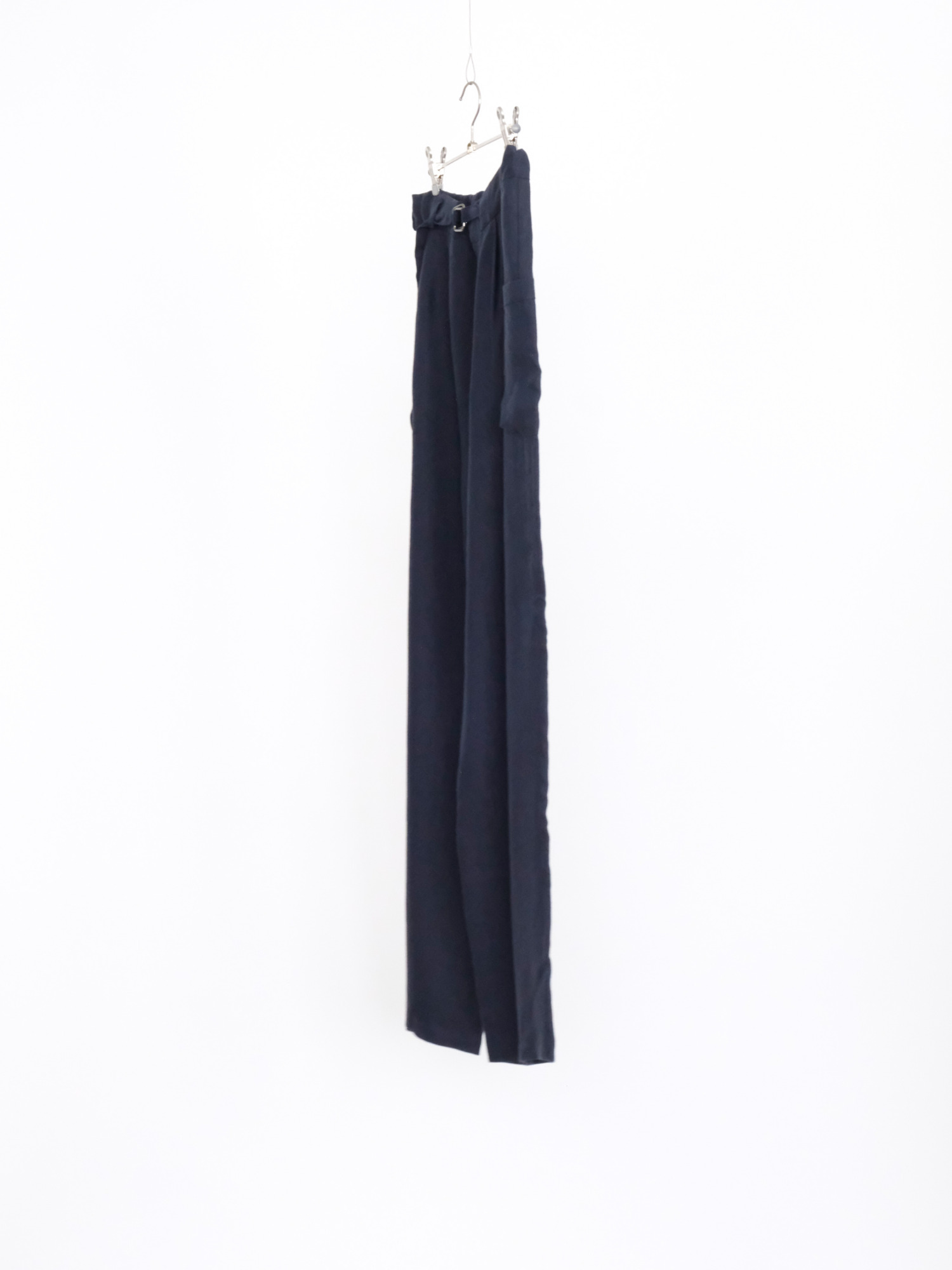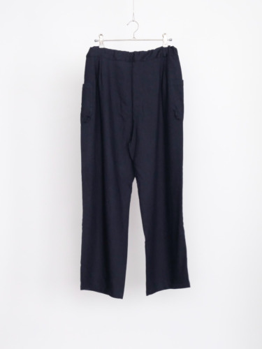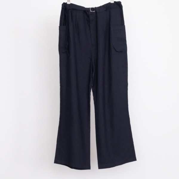ウエストは細いベルトが通してあり、角カンでウエストサイズを自由に調節できるデザインで、男女関係なく使えます。股上にも少しゆとりをもたせたイージーパンツらしいシルエット。股開きは、比翼仕立てでシェルボタンを使用してあります。