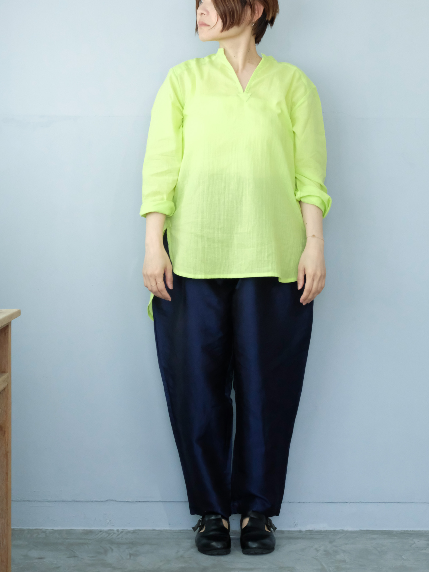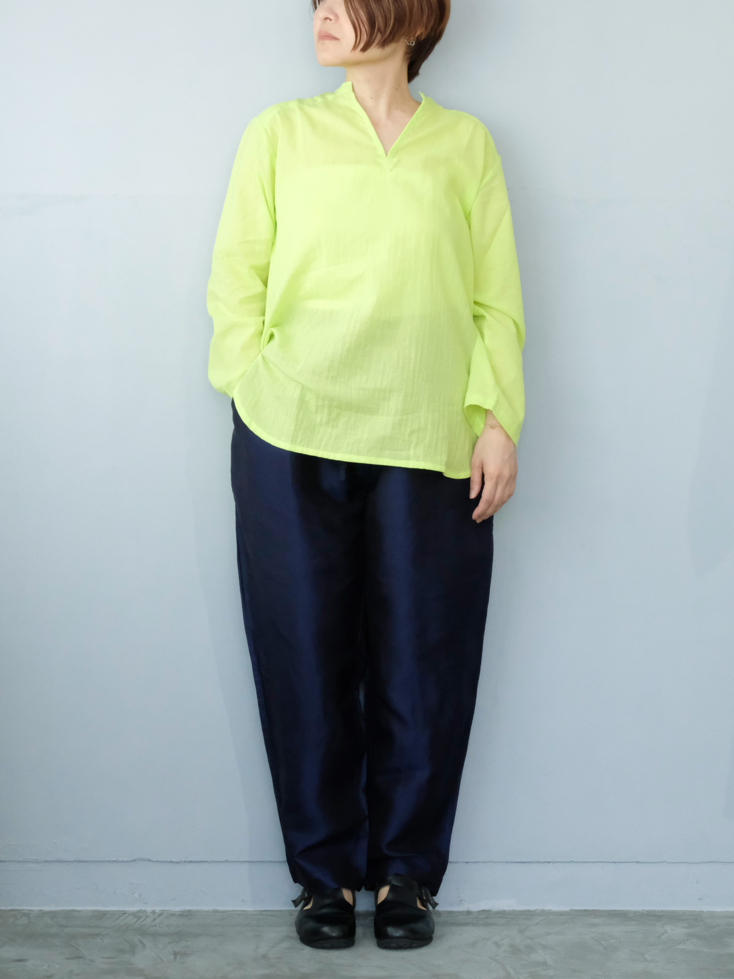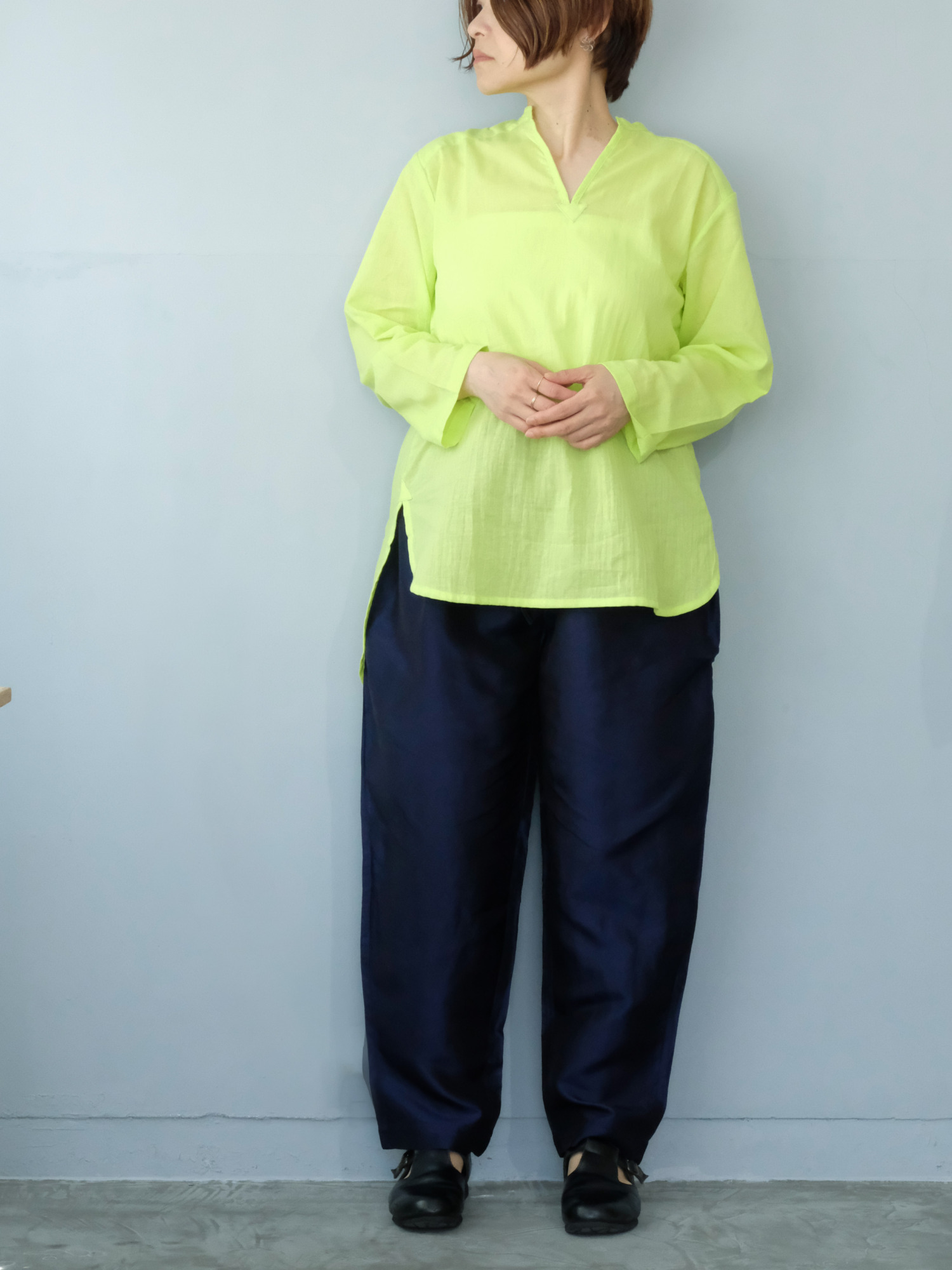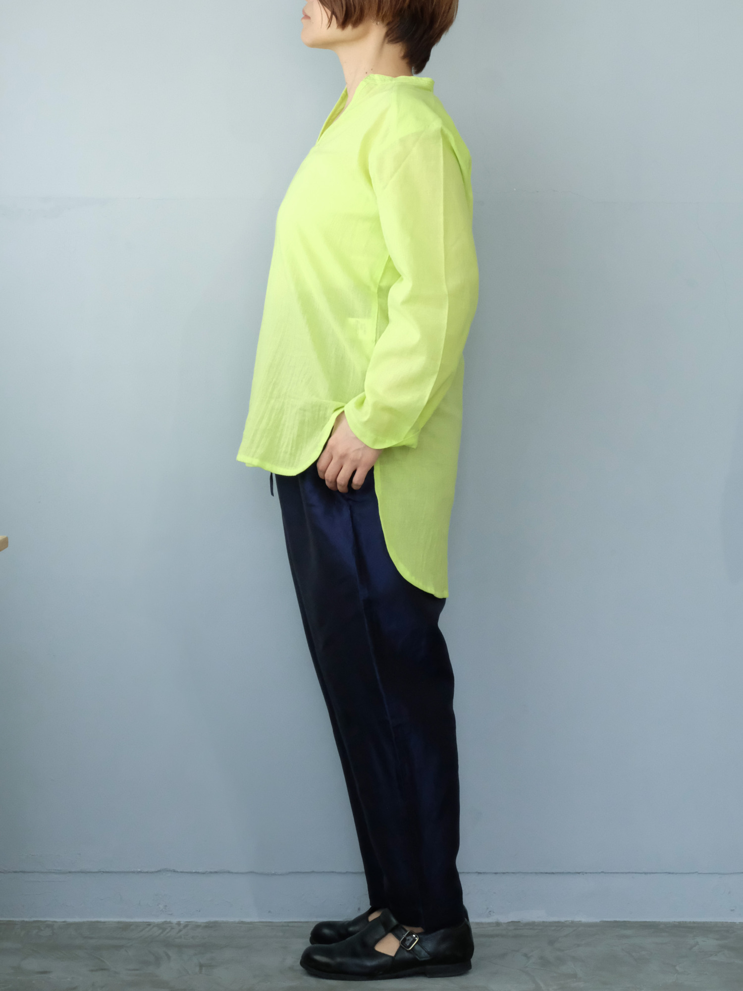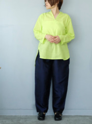 タイで生産された、ガーゼのような透け感のある綿を使った七分袖のシャツ。使用されている綿は軽く、透け感もあるので、涼やかに着ることができて夏の日差し除けにもおすすめです。